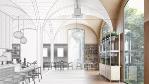 Empty large retro restaurant bar with tables and bar stools half blueprint half 3D rendered image